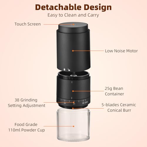 - Premium Material: Made from an ABS shell, this electric coffee grinder features a 25g bean box and a food-grade 110ml powder bin. Comfortable to touch, it is easy to clean, rust-resistant, and durable.