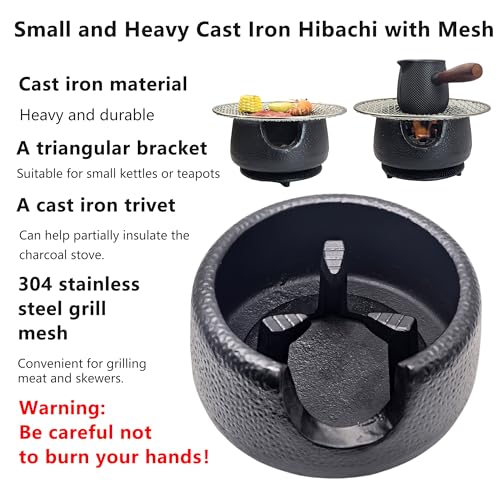Japanese Compact Cast Iron Charcoal Oven for Heating Teapots, Tea Stove Set, Kettle Warmer with Coaster, Barbecue Grill, Hibachi with 18/8 Stainless Steel Mesh