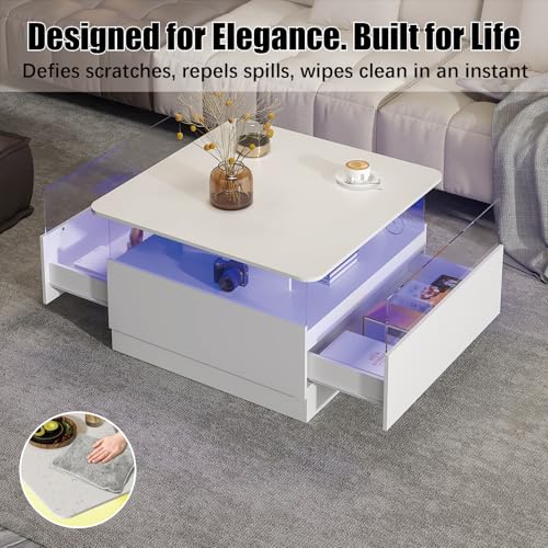 KEEPREAPER Square Coffee Tables with Storage, Contemporary Coffee Table for Living Room, White Circular Coffee Tables and 2 Spacious Drawers, Coffee Table with LED Illumination