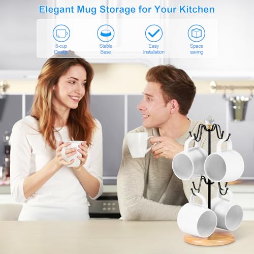 Keilend Mug Tree 8 Cup Holder Anti-Slip Iron Stand with Weighted Wooden Base, Elegant Coffee Cup Display for Kitchen Counter – Black