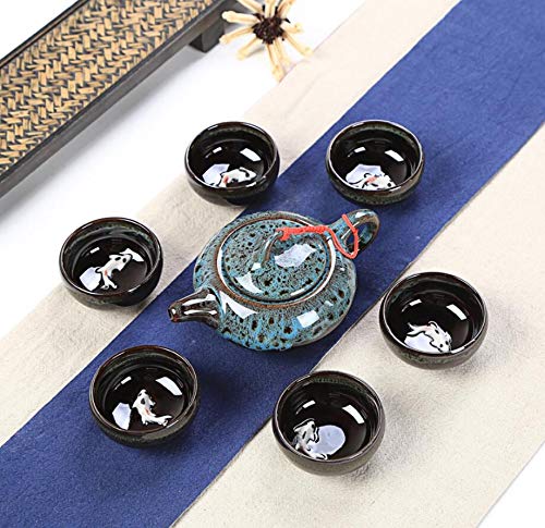 Kung Fu Teapot and Cup Set – Retro Handmade Porcelain Tea Set from China and Japan – 6 Tea Cups with Gift Box (Blue)