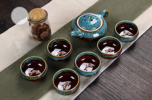 - Design: Traditional Chinese Kung Fu tea set with a glazed colour design, featuring a fish at the bottom of the cup, symbolising good fortune. The fish appears to swim as the tea is poured. The rich history of Chinese tea ceremony culture is profound and extensive, embodying a simple yet generous style, suitable for afternoon tea, family gatherings, or friendly meet-ups.