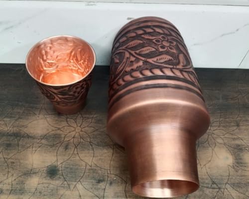 Lalit Kishori 100% Pure Copper Water Carafe with Matching Tumbler | Antique-Style Metal Pitcher | Ayurveda Health Benefits | 33.8 Oz Bedside Flask
