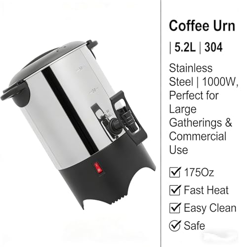 • High-Capacity & Fast-Heating for Large Gatherings: With a 5.2L (175 oz) capacity brewing up to 30 cups, this 1000W electric percolator swiftly delivers hot coffee, tea, or hot chocolate—ideal for gatherings, offices, events, and catering.