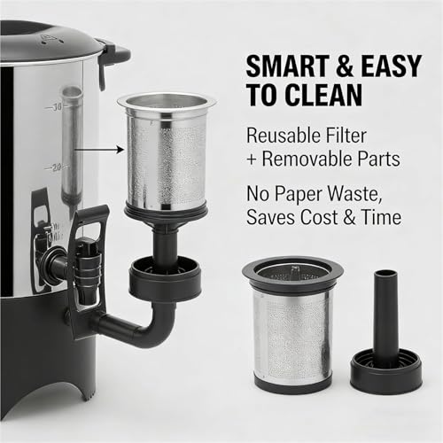 • Durable Food-Grade Stainless Steel Construction: Crafted with a 304 stainless steel inner pot and 201 stainless steel outer shell, this commercial-grade percolator guarantees taste purity, durability, and easy cleaning for long-term use.