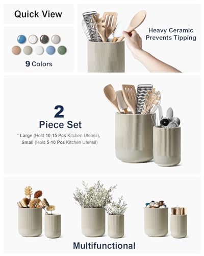 LE TAUCI Utensil Holder, 18.5+14cm Ceramic Kitchen Utensils Holder, Large Cooking Utensil Pots for Kitchen Counter, Modern Utensil Organiser for Spatula, Set of 2, Oatmeal Greige