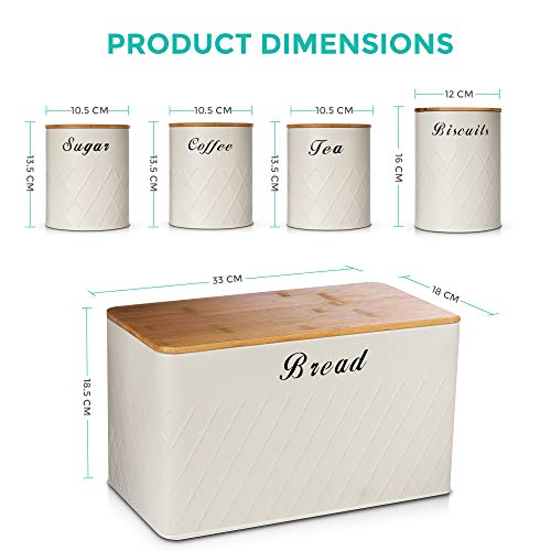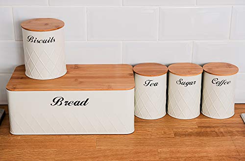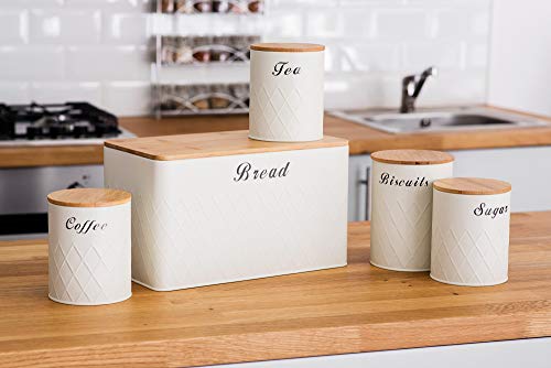 • 5PC KITCHEN STORAGE SET – Revamp your kitchen with this cohesive set featuring tea, coffee, and sugar canisters, a biscuit barrel, and a white bread bin. An ideal storage solution for maintaining tidy worktops while enhancing your kitchen ensemble, white bin, or cream kettle and toaster set.