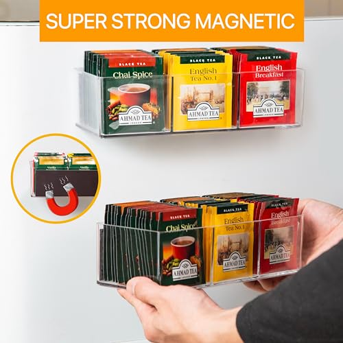 TelKeen Magnetic Tea Bag Holder Organiser for Up to 60 Tea Bags with 3 Compartments, Strong Magnetic Fridge Tea Storage Box (Acrylic, Magnet)