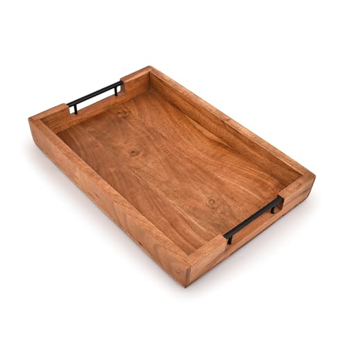Elegant Mahasu Acacia Wood Serving Tray with Metal Handles – Stylish Ottoman Coffee Table Accessory for Living Room & Kitchen (15" x 10" x 1.6")