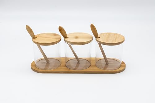 - Multi-Purpose Kitchen Storage – These versatile glass containers with wooden lids can be used as spice jars with spoons, tea canisters, food jars, or breakfast jars for oats and granola: store salt, herbs, spices, loose tea, or even dressings and sauces. A must-have household essential and kitchen organiser, this 3-piece set is ideal for pantries, countertops, and new home essentials.