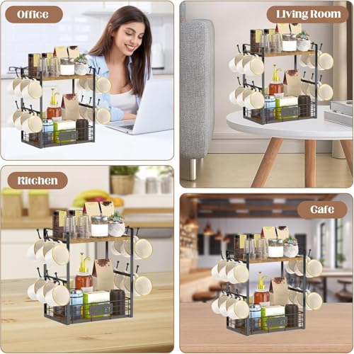 MEETOZ 2 Tier Coffee Station Organiser Countertop Rack, Multi-Functional Coffee Mug Holder Display Stand with 12 Hooks, Accessory Storage Shelf, Space-Efficient Coffee Nook Enhancer