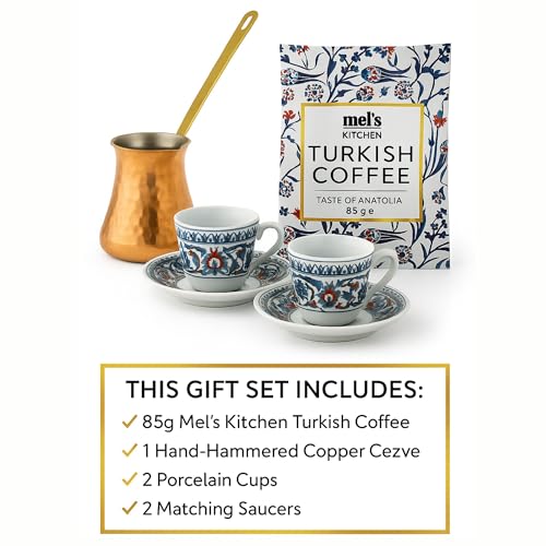 Mel’s Kitchen Turkish Coffee Gift Set – 85g Turkish Coffee, Copper Cezve Pot, 2 Porcelain Cups & Saucers – Genuine Taste of Anatolia