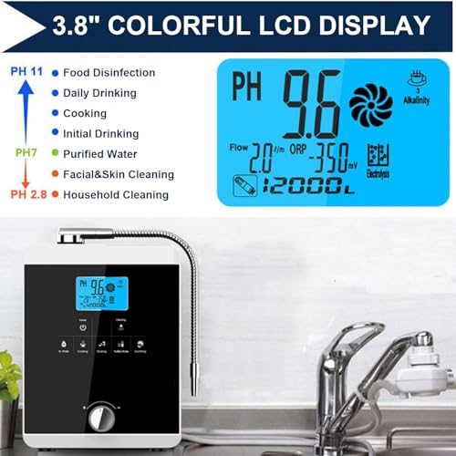 - ▶️ 3.8" LCD Smart Display The LCD showcases pH levels, ORP, flow rate, temperature, and filter lifespan, assisting users in selecting the appropriate water type. Blue indicates alkaline, green for purified, and red for acidic.