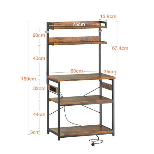 Coleshome Microwave Shelf Stand with Power Outlet & LED Lighting, Kitchen Storage Rack Featuring 5 Shelves and 5 Hooks, Industrial Coffee Bar, 35 x 80 x 150 cm, Rustic Brown