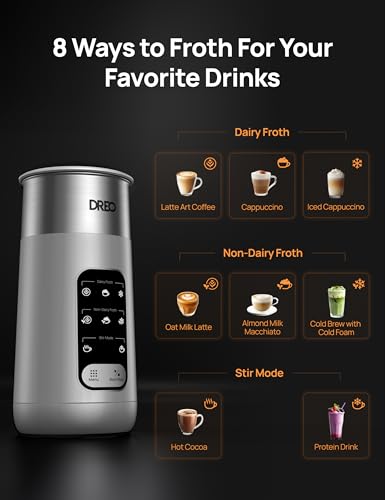 DREO 8-in-1 Electric Milk Frother: 435ml Silent Steamer & Hot Chocolate Maker, 45 dB Automatic Foam Frother for Latte Art Microfoam, Easy Clean in Silver Grey
