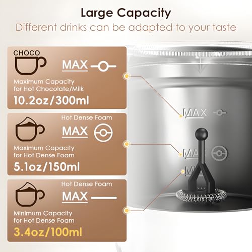 • Generous capacity: This milk frother features a generous capacity, capable of frothing up to 130 ml of milk and warming milk without foam up to 300 ml. The clear markings assist in preventing spills while filling.