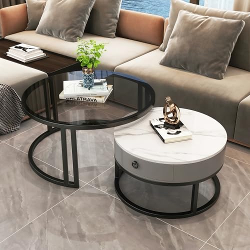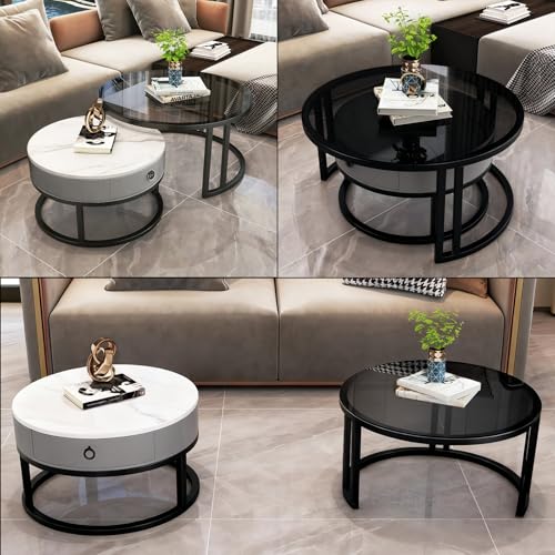 MJKCBD Coffee Table Set of 2, Stacking End Side Tables with Square Glass and Marble Top, Sofa Tea Table with Storage Drawers for Living Room Home Office (GREYROUND)