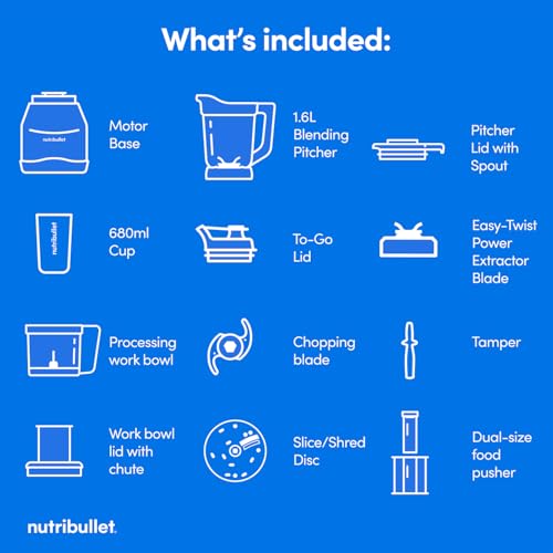 - WHAT’S INCLUDED: The nutribullet Triple Prep System includes a 1500W Motor Base, 7-Cup Processing Work Bowl with Dual Size Food Pusher, 1.6L Blending Pitcher, 680ml Cup, Easy Twist Power Extractor Blade, Chopping Blade, Slice/Shred Disc, To-Go Lid, Tamper, and an Instruction Manual with Recipe Guide.