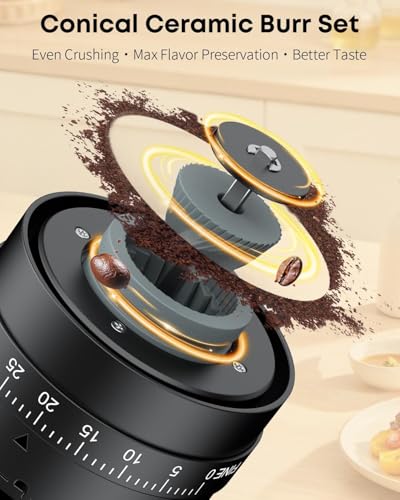 - Powerful Ceramic Burr: Equipped with a set of conical ceramic burrs, this electric coffee grinder crushes beans uniformly without heat buildup (up to 25 g per session), effectively preserving essential oils and aromatic compounds for a richer flavour in every cup.