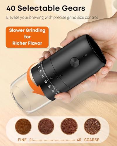 - 40 Selectable Gears: Elevate your brewing journey with precise control over grind texture! The adjustment ring provides 40 unique settings, from ultra-fine for espresso to coarse for cold brew. (Tip: The grinding speed is relatively slow. Gentle grinding ensures superior taste.)