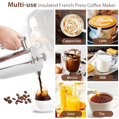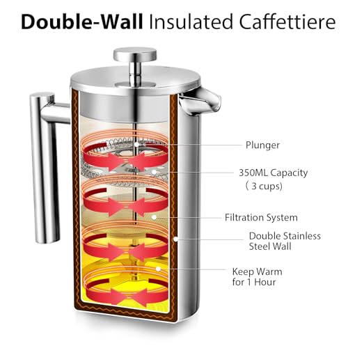 Pecihiko 12oz / 350ml French Press Coffee Maker – 3-Cup Stainless Steel Double-Wall Insulated Cafetière for Home, Office, Travel, Camping