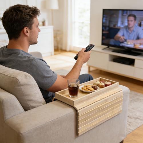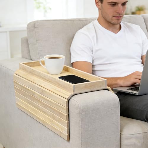 - Versatile Multi-Function Couch Table: Experience the ultimate convenience of this multi-functional sofa arm tray. The protective lip not only keeps your sofa clean but also transforms this Bamboo Couch Armrest Table into a versatile hub for your activities. Use this sturdy wooden tray as a stable laptop desk for working, a secure coffee cup holder, a dining surface for snacks, or a book rest.