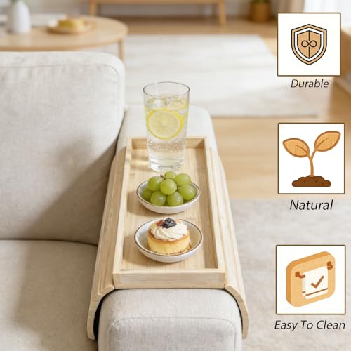 - Premium Natural Bamboo Construction: Crafted from high-quality, sustainable bamboo, this sofa arm tray introduces natural sophistication to your living area. This robust Bamboo Couch Armrest Table is constructed from safe, non-toxic materials, ensuring it is entirely safe for you and your family. Its sturdy design guarantees it will endure daily use, providing a dependable and stylish surface for years to come.