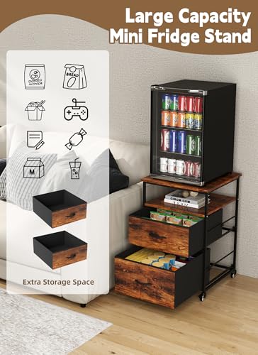 Compact Qriocioa Mini Fridge Stand with Storage – Small Beverage Refrigerator Stand Featuring 2 Fabric Drawers, Mobile Cabinet Rack in Vintage Brown
