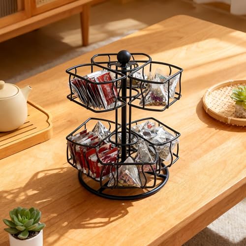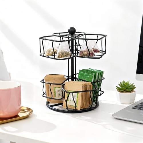 Qukoielly Carousel Tea Bag Holder | 2-Tier Metal Rotating Coffee Pod Organiser – Coffee Creamer Sugar Basket Holder – for Office Kitchen Counter Cabinet Pantry Apartment