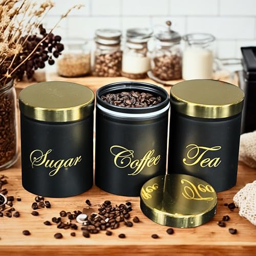 RLS Black Set of 3 Tea, Coffee, Sugar Canisters Storage Container Collection for Kitchen Essentials | Black & Gold