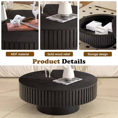 Round Fluted Coffee Table with Storage 80CM Wooden Drum Coffee Table Modern Luxury Circular Drum Centre Tables with Solid Wood Veneer, Accent Side Table for Living Room, Apartment (Round Black)