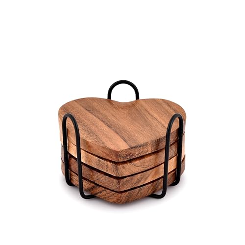 Samhita Acacia Wood Heart-Shaped Coaster Set of 4 with Iron Holder for Coffee Table Décor, Housewarming Gift, New Home Kitchen Decoration (10.16cm x 10.16cm x 1.27cm)
