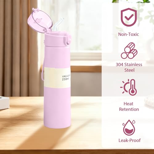 Senshuomy 8.8oz Mini Water Bottle, Compact Flasks, Stainless Steel Insulated Water Bottles, Leakproof Drink Container with Carry Handle for Hot & Cold Beverages, Coffee, Juice (Pink)