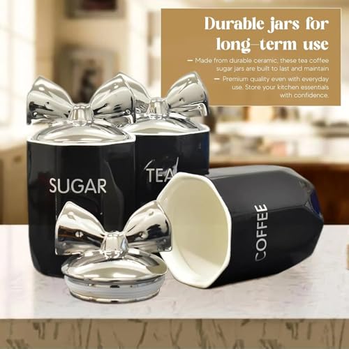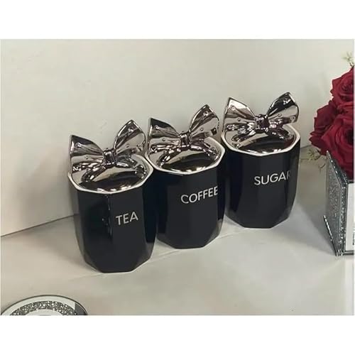 - π Elegant Marble Design: Each canister showcases a sleek black marble effect ceramic finish, complemented by a sparkling silver bow lid, bringing sophistication to any kitchen.
