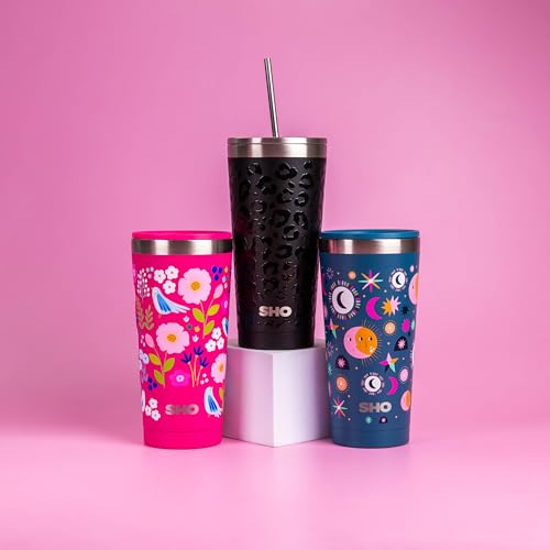 SHO Calix Insulated Stainless Steel Coffee Mug & Tumbler with Slider & Straw Lid, Keeps Hot for 6 Hours & Cold for 12, Splash-Proof, 500ml (Black Leopard)