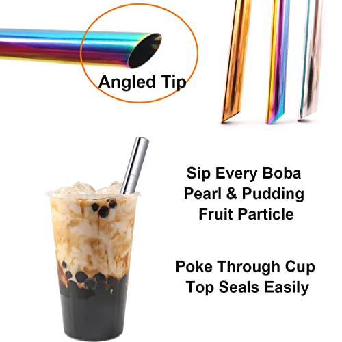 • Bubble Tea Straws Metal Extra Wide, Personal Reusable Metal Boba Straws Practical / Portable / Convenient Design. 215MM/8.5Inch Length, Suitable for 20/30/40 oz Cups, Tumblers, Mason Jars, Yeti, Venti. Angled Tips Sharp Ends Straws Will Puncture Sealed Tops Easily.