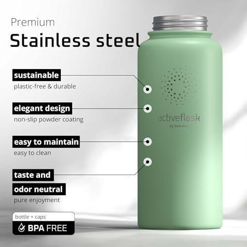 • πŸš€ Premium Double-Layered Vacuum Insulated Bottle – The top-rated double-layered vacuum insulated stainless steel bottle comes with three different caps for everyday use, sports, and outdoor activities. Height: 24.2 cm, Ø 9.1 cm, Volume: 950ml, Weight: 439g.