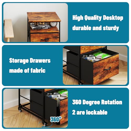 Suuiwau Compact Mini Fridge Stand with Storage, Vintage Brown Rolling Refrigerator Table for Kitchen, Office, Bedroom, and Dorm