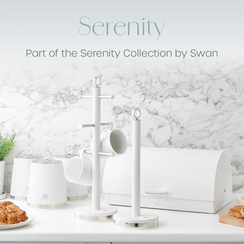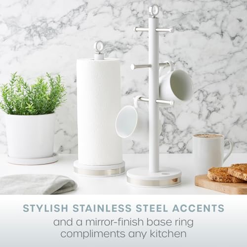 Swan Serenity Kitchen Towel Stand and 6 Cup Mug Tree Collection with Smooth Matte Surface, Stainless Steel Details and Non-Slip Bases, White, 13.5