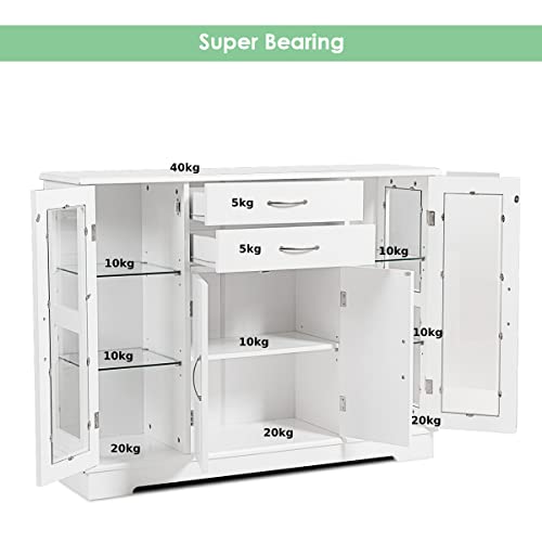 TANGZON Storage Cabinet – Sideboard with 2 Glass Doors, 2 Drawers & Adjustable Shelves, Wooden Buffet Cupboard for Kitchen, Dining Room & Living Room (White)