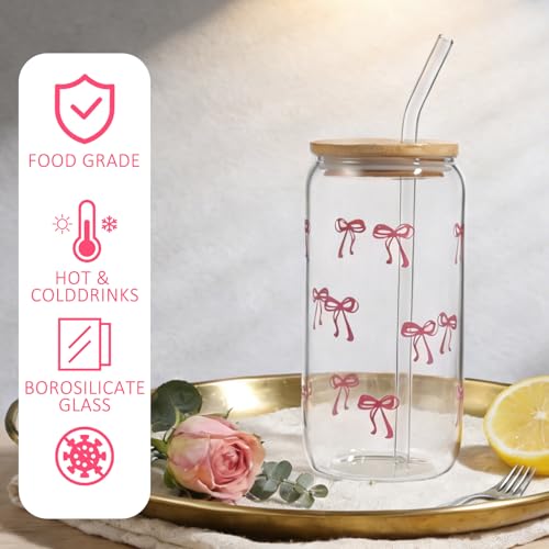 ToKinCen Bow Glass Cup – 16 oz Bow Iced Coffee Glasses with Lids, Straws, and Cleaning Brushes – Adorable Pink Bow Glass Cups for Women, Girlfriend, or Wife