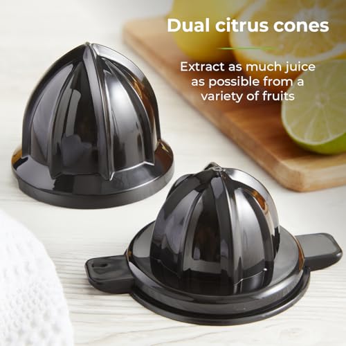 • DUAL CITRUS CONES: Extract maximum juice from a variety of citrus fruits such as oranges, lemons, limes, and grapefruits using two different sized cones, ensuring maximum extraction and taste.