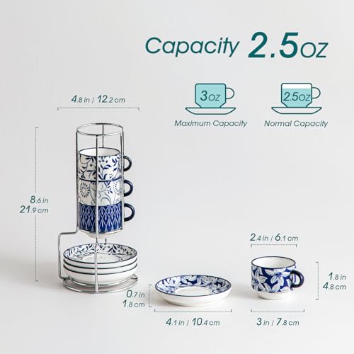 vancasso Selene Espresso Cups Set of 4, 2.5oz/75ml Cup and Saucer Set, Porcelain Coffee Cups with Metal Stand, Microwave & Dishwasher Safe, Ideal for Turkish Coffee, Espresso, Macchiato