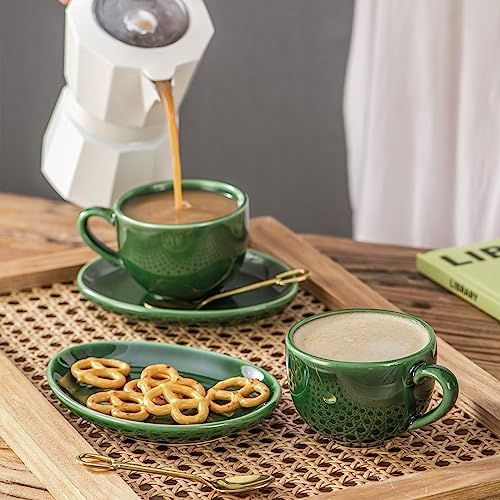 Vicrays Ceramic Espresso Coffee Cups – 4 oz Porcelain Espresso Cups Set with Saucers, Spoons, and Metal Stand for Tea, Cafe, Cappuccino, Latte – Set of 6 – Green