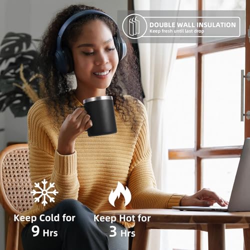 Volhoply 12oz Insulated Leakproof Coffee Mug with Sliding & Straw Lid, Double Wall Vacuum Stainless Steel Travel Cafe Tumbler Cup with Handle, Reusable Camping Mugs Keep Cold/Hot (Black, 1 Set)