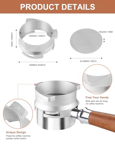 - PACKAGE INCLUDES: High-quality 54mm Dosing Funnel and 53.5mm Puck Screen Set. We are dedicated to providing top-notch coffee accessories for enthusiasts and masters, enhancing convenience and enjoyment in your coffee-making process.