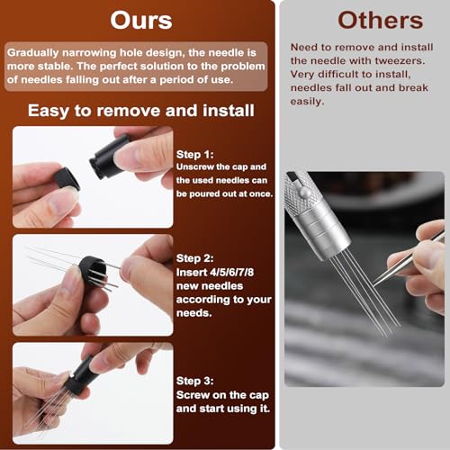 • [About Coffee Distribution Stirrer]: Espresso WDT Tool-Coffee Distribution Stirrer features up to 8 needles. It is designed to break apart clumps, create a uniform coffee bed, and ensure consistent density in your basket. The 0.25mm needle (Slightly sharp and requires careful usage) facilitates better extraction, resulting in a smoother espresso. The agitator is secured to the iron frame by magnetic suction, ensuring perfect preservation and ventilation of the mixing needle, preventing deformation.