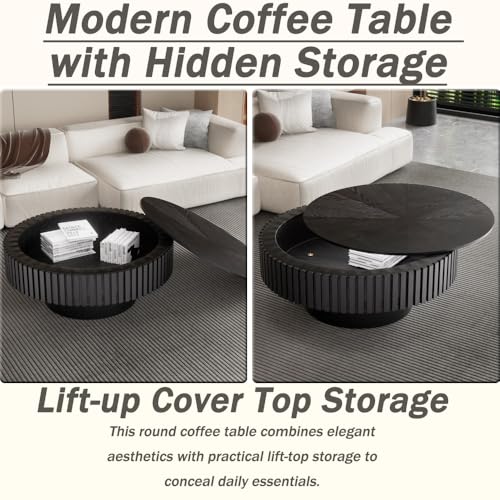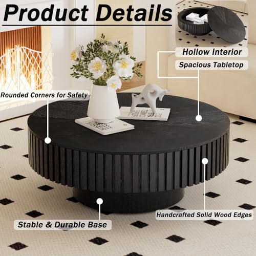 Wxnnx Round Coffee Table with Storage, Modern Handcrafted Fluted Drum Coffee Table Wood Circle Centre Table with Sturdy Pedestal for Living Room Apartment (Black)