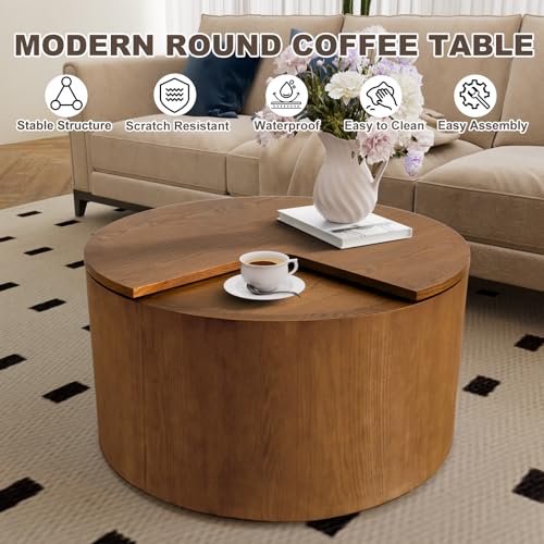 - Rich Wood Grain Finish & Timeless Drum Design: Showcasing a warm wood grain veneer on a sleek drum base, this round coffee table with storage boasts a circular profile that fits seamlessly into Modern Farmhouse, Mid-Century, and Contemporary interiors.