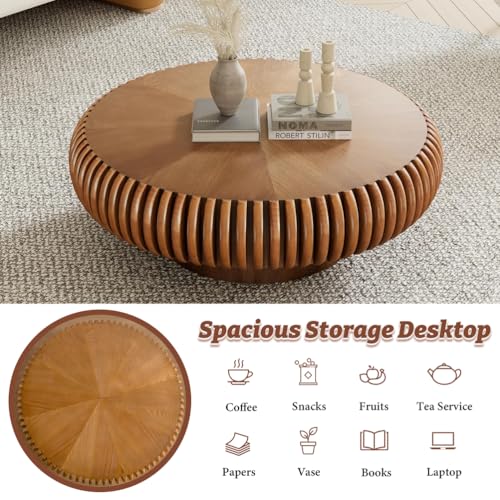 YAOBAO Round Fluted Coffee Tables for Living Room, Contemporary Wooden Circle Coffee Table, Brown Handcrafted Circular Centre Table Low Unique Accent Tea Tables for Compact Apartment, 80cm
